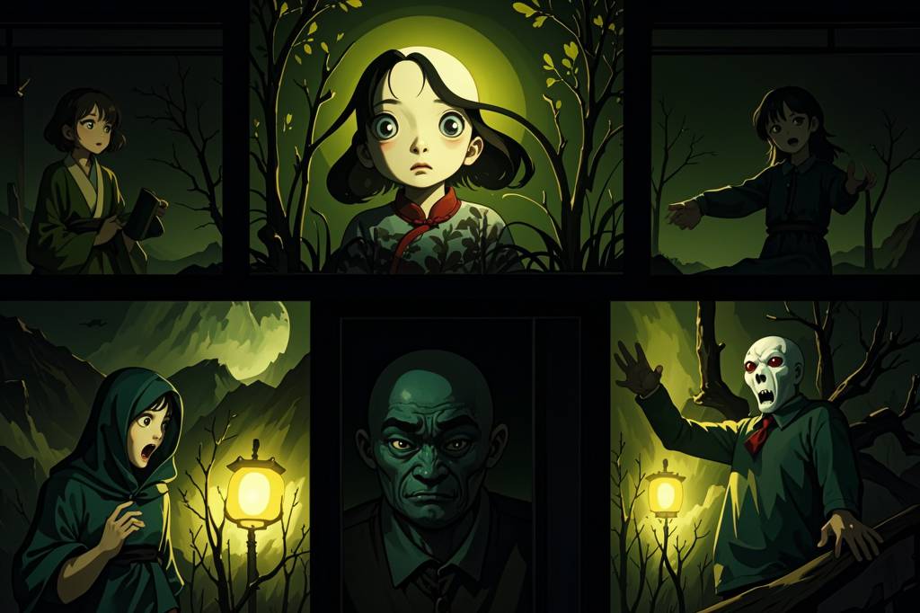 中国,鬼怪,荒诞,光影交错,电影质感,恐怖氛围,暗黑风格,惊悚,吓人,诡异,阴暗,伊藤润二,超现实的风格,随机场景,电影画质,超清晰(96)