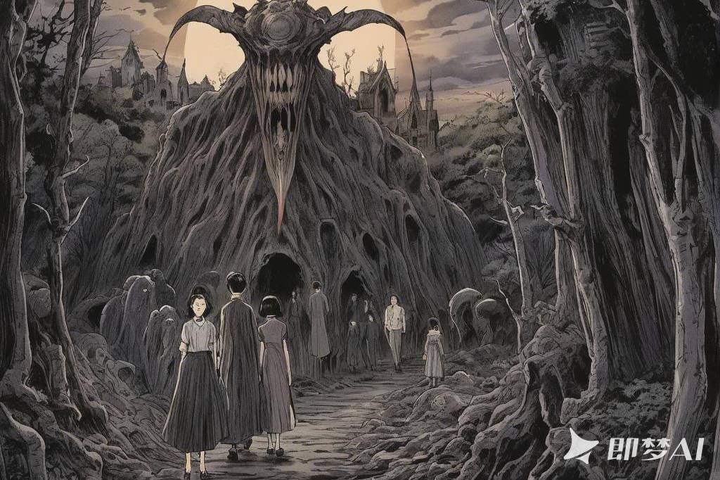 吓人、荒诞、恐怖氛围,包含惊悚、诡异元素,并借鉴伊藤润二风格与哥特式风格,多变场景(1)