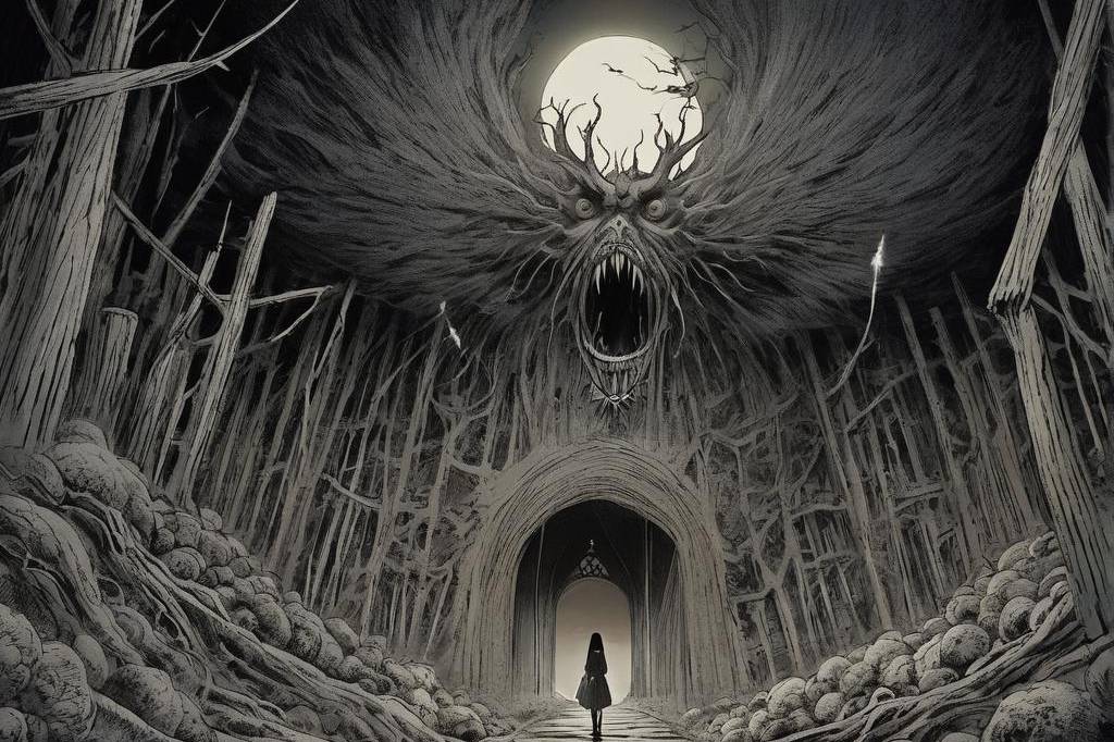神秘、荒诞、恐怖氛围,包含惊悚、诡异元素,并借鉴伊藤润二风格与哥特式风格,多变场景(66) png(1)