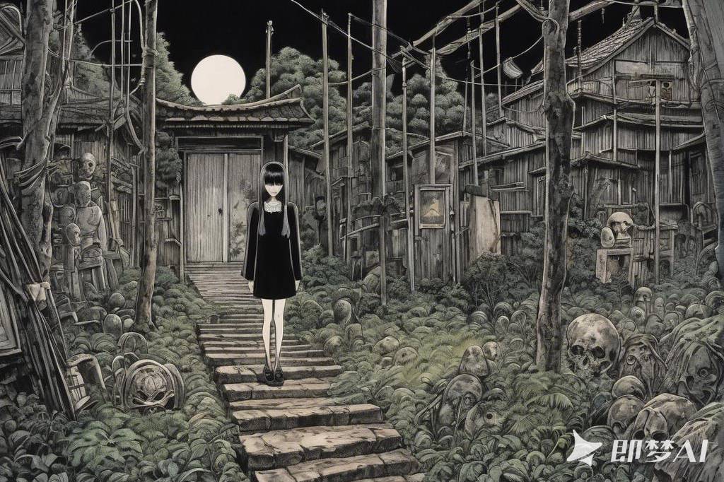 神秘、荒诞、恐怖氛围,包含惊悚、诡异元素,阴郁美学,毛骨悚然,阴森,超现实,不可名状,并借鉴伊藤润二风格与哥特式风格,细节丰富(54)