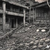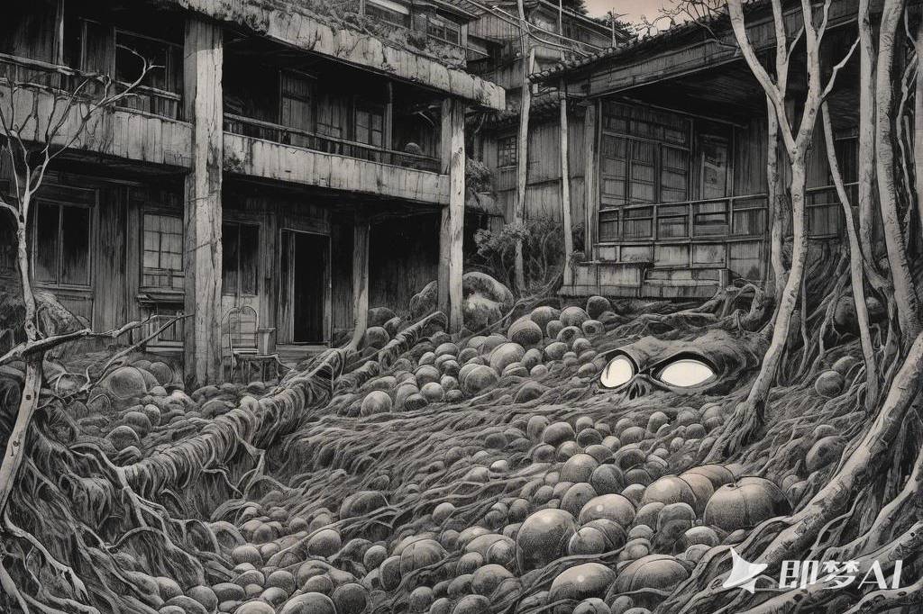 神秘、荒诞、恐怖氛围,包含惊悚、诡异元素,阴郁美学,毛骨悚然,阴森,超现实,不可名状,并借鉴伊藤润二风格与哥特式风格,细节丰富(55)
