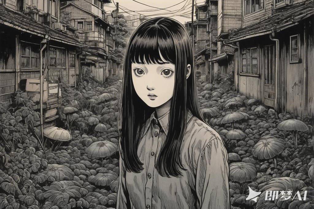 神秘、荒诞、恐怖氛围,包含惊悚、诡异元素,阴郁美学,毛骨悚然,阴森,超现实,不可名状,并借鉴伊藤润二风格与哥特式风格,细节丰富(75)
